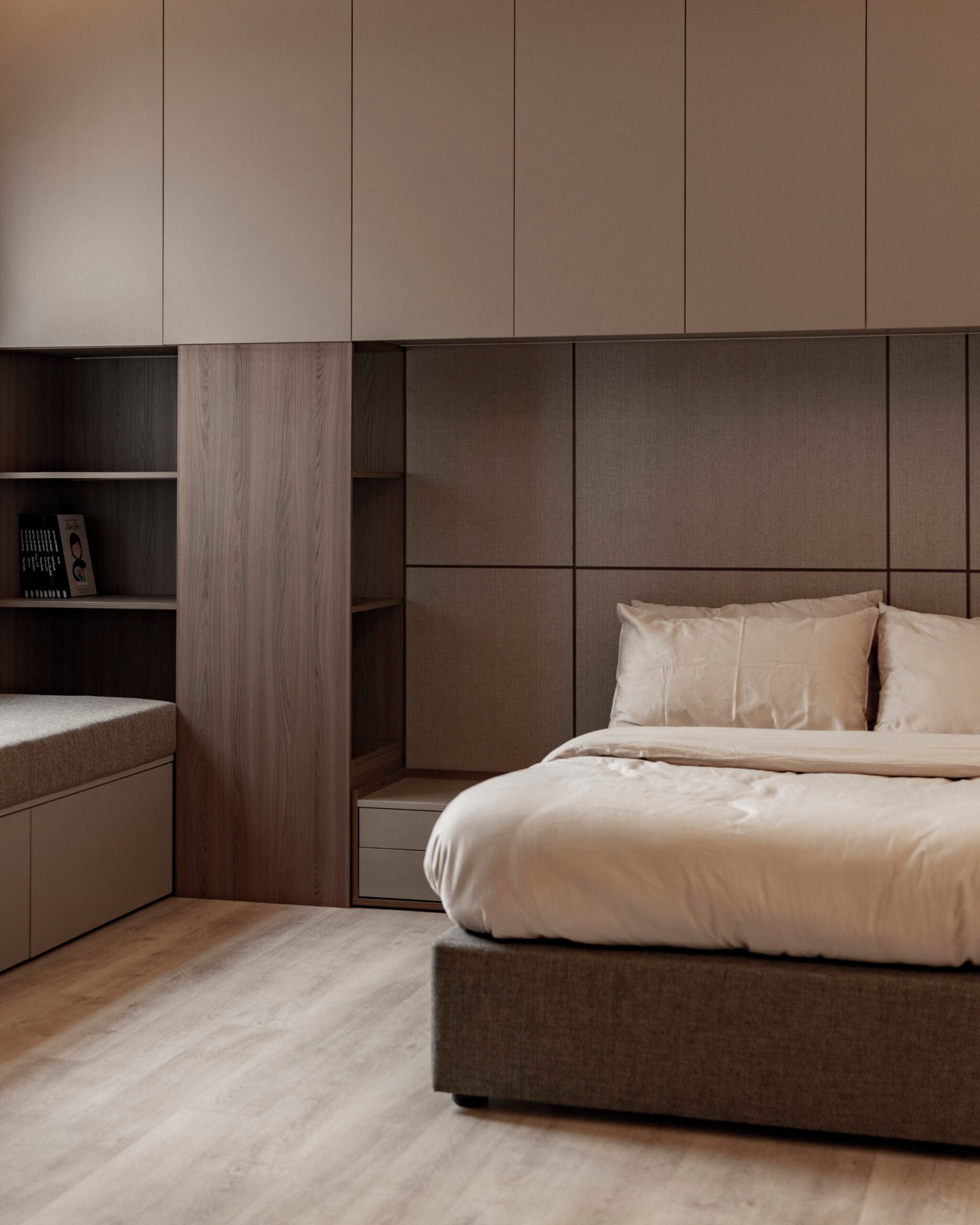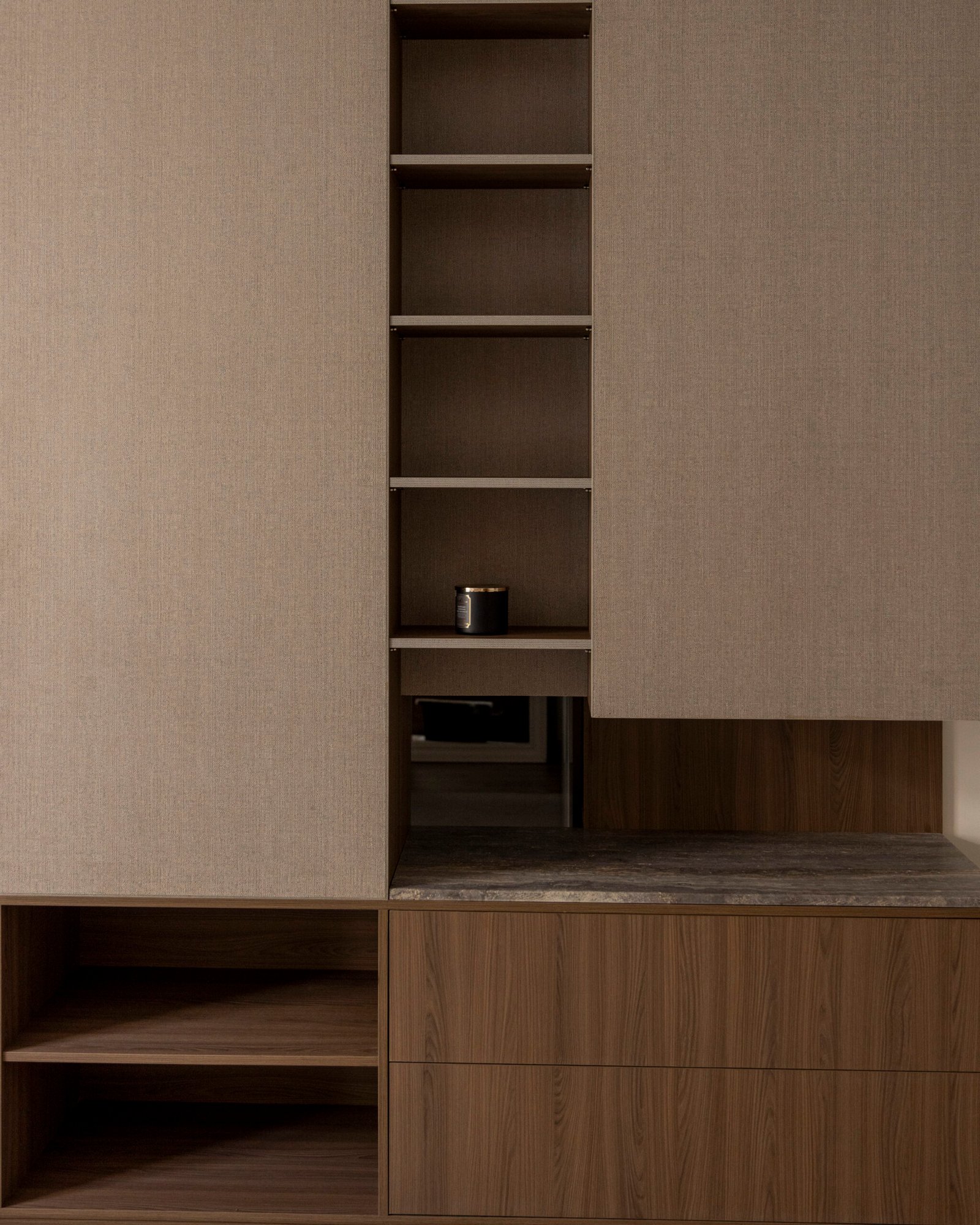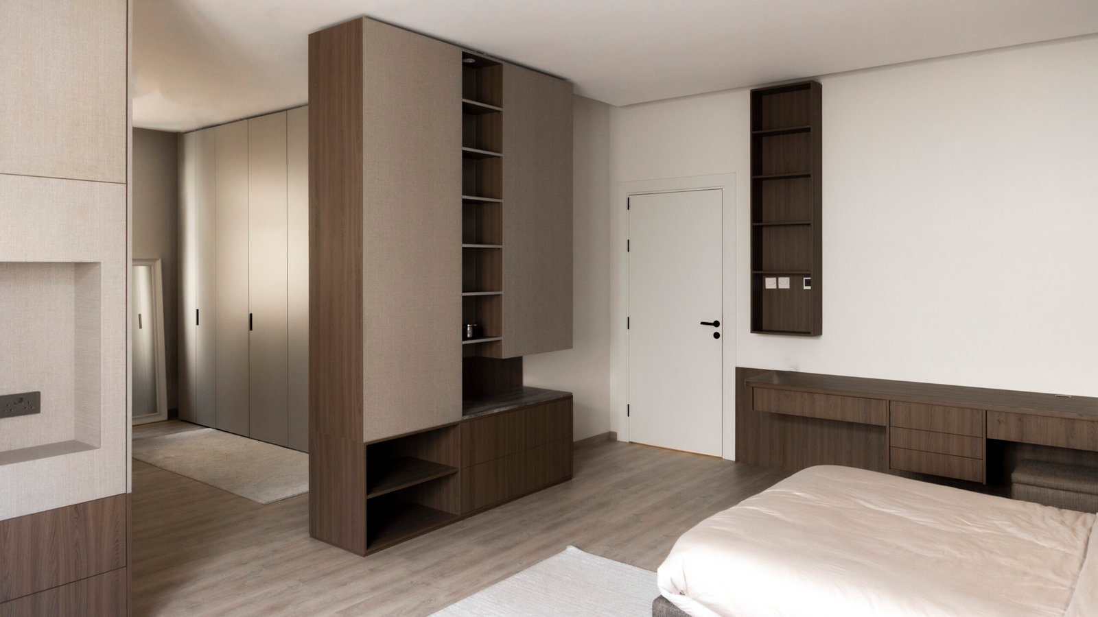 Soft neutral tones, natural wood, and textured fabrics create a calm foundation, while refined detailing and custom joinery add sophistication and comfort.